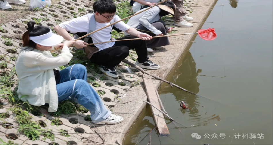 活动伊始,同学们相互配合,开展了一个兼具乐趣与挑战的项目——钓虾。大家在指定的地点筹备钩饵、钓具和网兜等工具,轻轻将钩子沉入水中,谨慎地保持钓竿稳定,耐心等待着龙虾上钩。在同学们的相互努力和积极配合下,大家都收获颇丰,成就感满满!