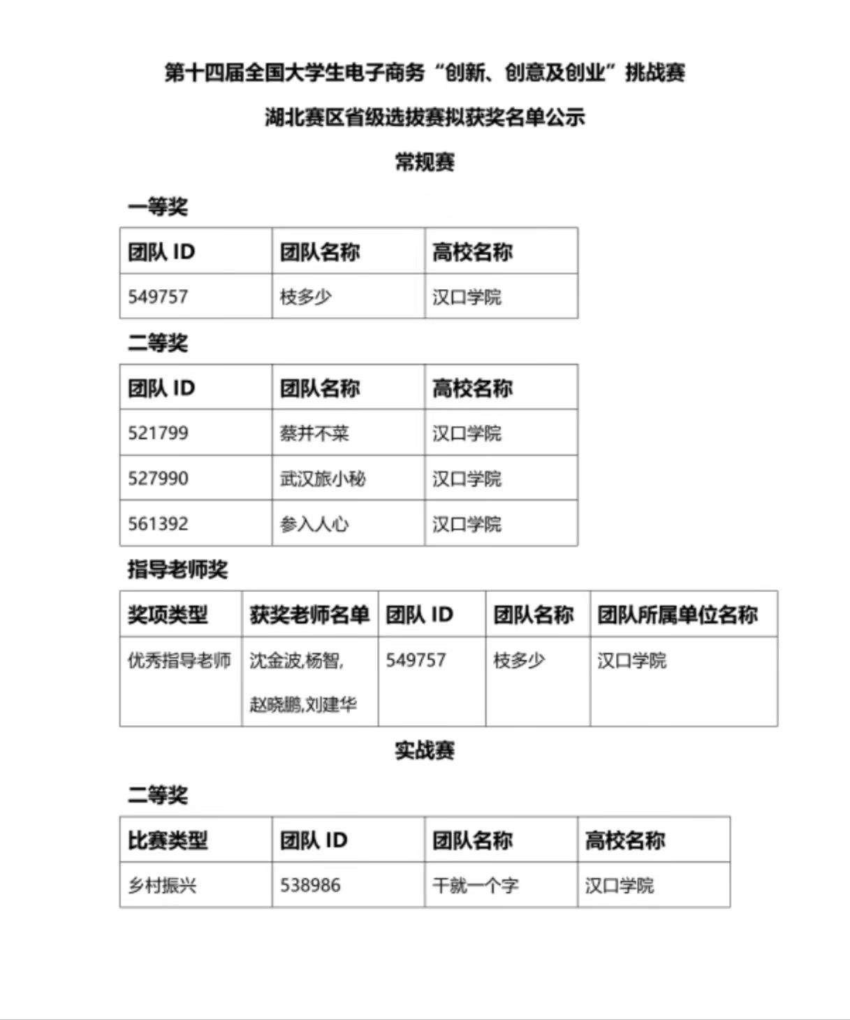 在此次比赛中,我校共有多支队伍参赛,并荣获多项奖项。由高新雨带领的“枝多少”团队凭借其创新项目,获得了常规赛一等奖,其指导老师沈金波、杨智、赵晓鹏、刘建华凭借出色的指导工作,荣获“优秀指导老师”奖;由蔡国敬带领的“蔡并不菜”团队、胡浠雅带领的“武汉旅小秘”团队以及杨柳带领的“参入人心”团队则在常规赛中分别获得了二等奖。此外,在实战赛的乡村振兴项目中,代紫璇带领的“干就一个字”团队也荣获二等奖。这些获奖队伍体现了学生们在电子商务领域的卓越创意和实践能力,展示了我校在电子商务教育方面的丰硕成果。