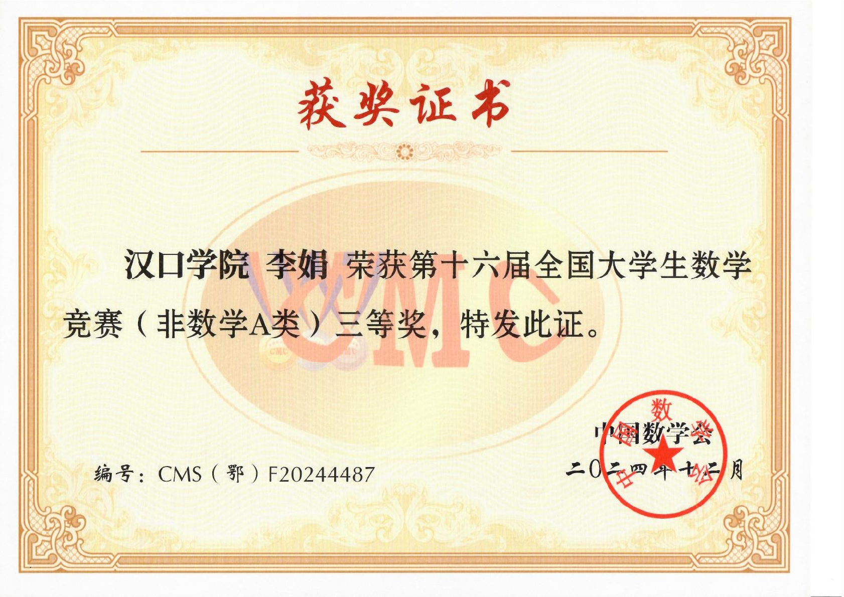 李娟荣获第十六届全国大学生数学竞赛(非数学A类)三等奖