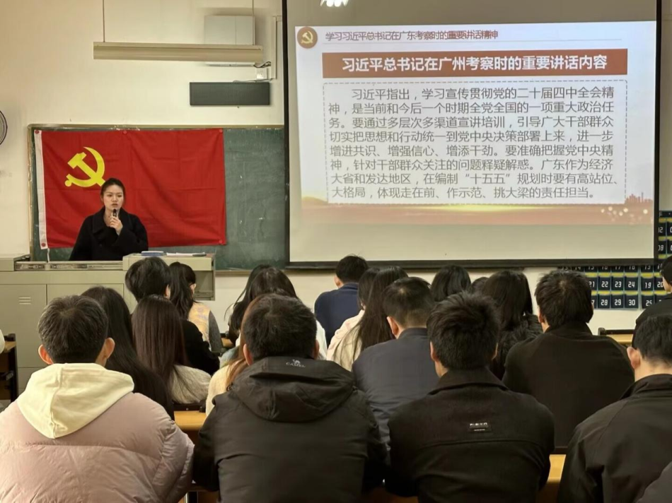活动伊始,全体起立奏唱国歌,邓萌同志带领党员重温入党誓词,并通报党员到会与本月党费缴纳情况。随后,邓萌同志领学习近平总书记在广东考察时的重要讲话精神,要求党员领会 “走在前、作示范、挑大梁” 的担当;组织员陈霞结合学院实际,讲解本科教学评估知识,提示党员迎检职责。